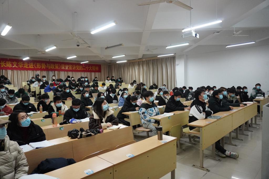 课堂上,陈文华带领同学们梳理了党的二十大报告,结合陈文兴校长作为党的二十大代表光荣参会的事例介绍了二十大的基本概况,阐述了学习二十大精神的重要意义。他强调,要以中国式现代化全面推进中华民族的伟大复兴,并要求同学们从二十大主题、过去五年的工作和新时代十年的伟大变革、开辟马克思主义中国化时代化的新境界、新时代新政策中国共产党的使命任务等九个方面深刻领会二十大精神。