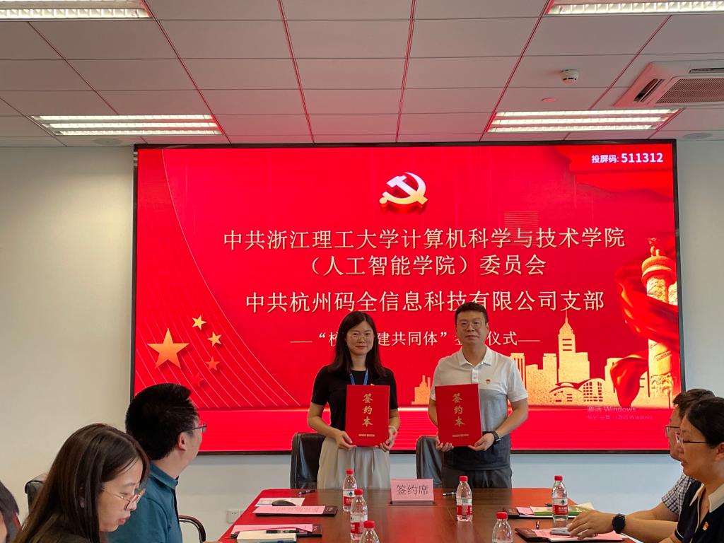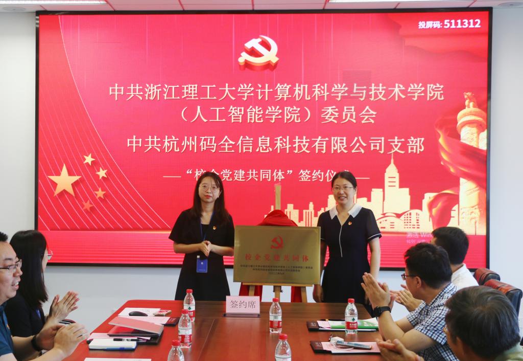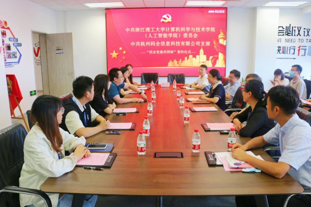 为进一步深化党建引领、深入推进党建“四个融合”行动,强化校企产学研合作,9月20日下午,计算机科学与技术学院(人工智能学院)与杭州码全信息科技有限公司在码全科技会议室举行了校企党建共同体签约仪式暨学院党委理论学习中心组9月专题学习会议。中共tyc33455cc太阳集团成网官方入口计算机科学与技术学院(人工智能学院)委员会理论学习中心组全体成员、中共杭州码全信息科技有限公司支部支委和党员代表参加此次活动。