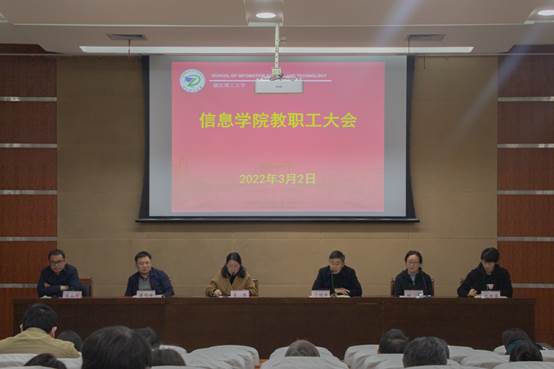 2022年3月2日下午,信息学院在行政楼二楼报告厅召开全院教师大会,全面部署新学期各项工作,会议由学院党委书记黄黎主持,党政班子成员、全体教师参加会议。