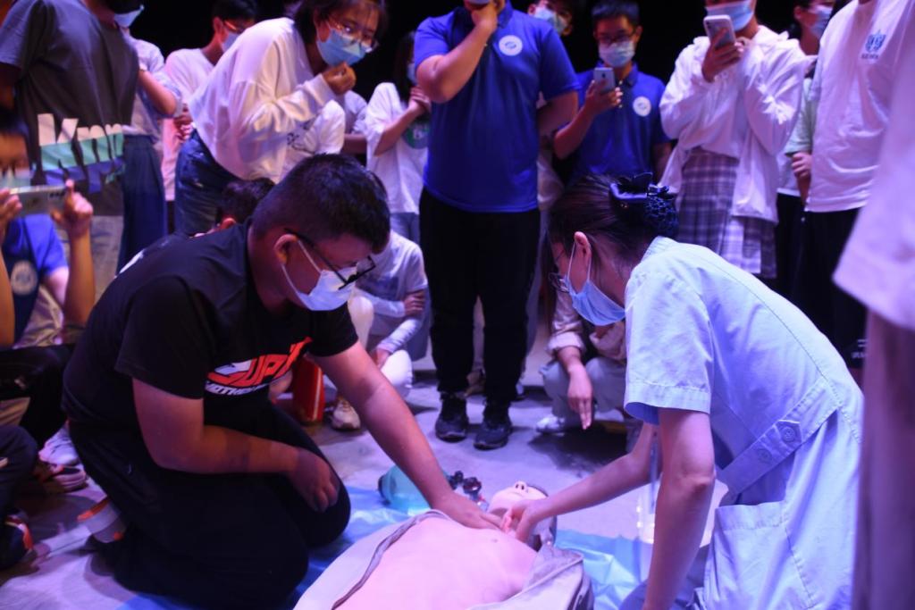 接着进入第二个环节——实操环节,陈晓烂护士长利用人体模型为同学们演示刚才所讲述的心肺复苏急救手法和人工呼吸,部分同学上台围观并进行了实操。在动手操作过程中真正学到了急救技能,现场迸发出阵阵掌声。