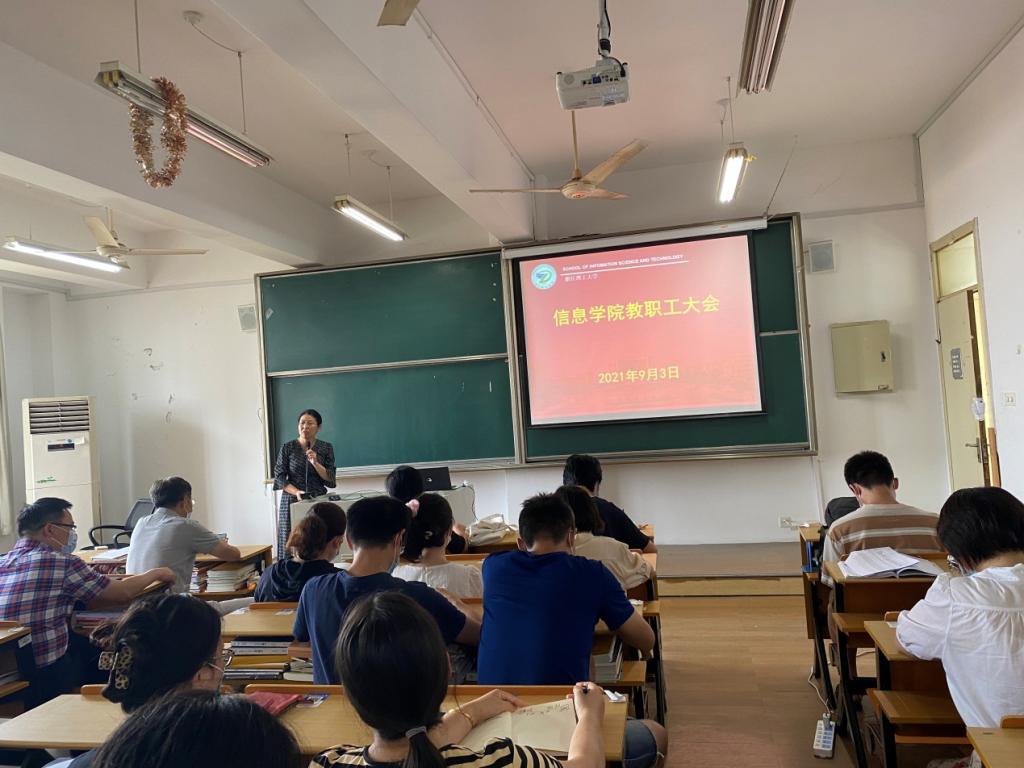 在下午的学院全体教职工大会上,黄黎介绍了新入职教师,传达了校党委书记吴锋民、校长陈文兴在2021年新学期工作部署会暨暑期中层干部培训班上的讲话精神,深入分析学院下一阶段发展定位,明确各项工作的着力点,希望全体教职工群策群力助推学院实现新跨越。各分管领导对新学期学科建设、科研、教学、人才培养、学生工作等相关工作作了部署,并对教职工纪律考勤、疫情防控等作了强调和部署。