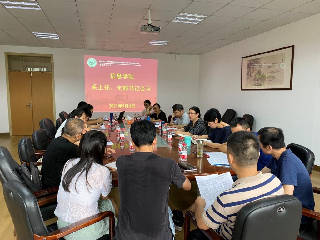 在上午召开的系主任、党支部书记会议上,黄黎带领全体与会人员学习了校长陈文兴《展望“十四五”谋划新发展,确保开局之年起好步》和校党委书记吴锋民在2021年新学期工作部署会暨暑期中层干部培训班上的讲话内容,同时结合2021年新修订的《中华人民共和国教育法》宣传学习,以及教育部公开曝光第七批8起违反教师职业行为十项准则典型案例的学习教育,要求各系、党支部组织教师政治理论学习,在具体工作中抓好贯彻落实,从而进一步增强高校教师的责任感和使命感,助力学院“十四五”开好局起好步,为学校事业发展做出积极贡献。院长丁佐华传达了博士点申报通过情况,并就今后人才引进、科学研究、学科评估等重点工作作了谋划和展望,希望全院教师齐心协力,立足当下,着眼未来,提前谋划,在学院各项工作中取得好的成绩。同时,各分管领导分别对照学院年度工作目标,结合上半年工作开展情况,对新学期党史学习教育、新教育法学习、师德师风建设、疫情防控、教学、科研、实验室建设、创收、研究生培养、学生工作等作了研究和部署。