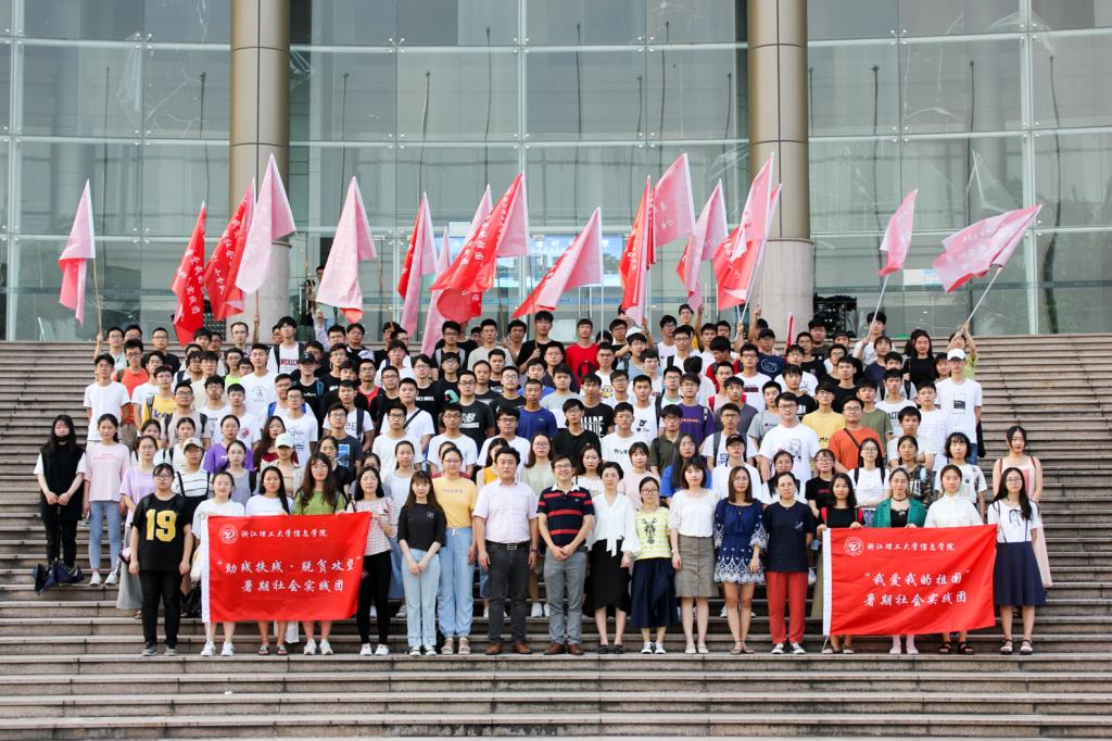 团学会团委书记助理王嵩文上台宣读暑期社会实践倡议书,希望大家能在实践中“获取知识、锻炼能力、提升素养”,他也强调了社会实践中的安全问题。随后,方水明和尹小虎向各暑期社会实践小分队授旗。在仪式的最后,方水明进行了总结发言,他肯定了上一届学生组织的工作成果,并对下届团学会的工作开展提出了自己的希望。同时,他还强调了社会实践过程中的几项重要工作:安全保障、团队意识、宣传工作。并祝愿信息学院实践团队能顺利圆满完成实践任务。活动结束后在场全体成员进行了合影留念。