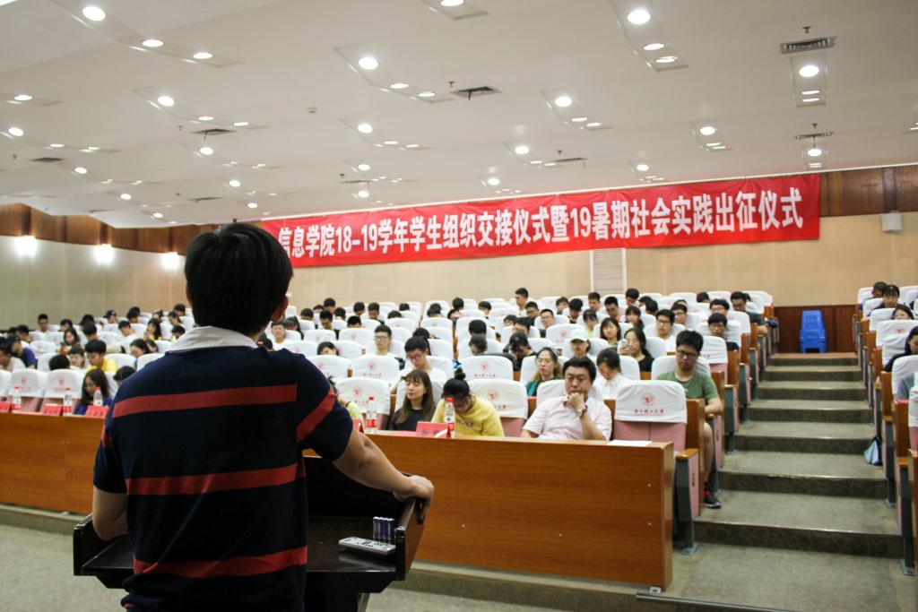 为使新学年学生组织工作开展更加顺利,锻炼学生组织新成员能力,6月28日下午,tyc33455cc太阳集团成网官方入口信息学院18-19学年学生组织交接仪式暨2019年暑期社会实践出征仪式于tyc33455cc太阳集团成网官方入口行政楼二楼报告厅正式举行,会议由团学会主席肖芙苏主持。
