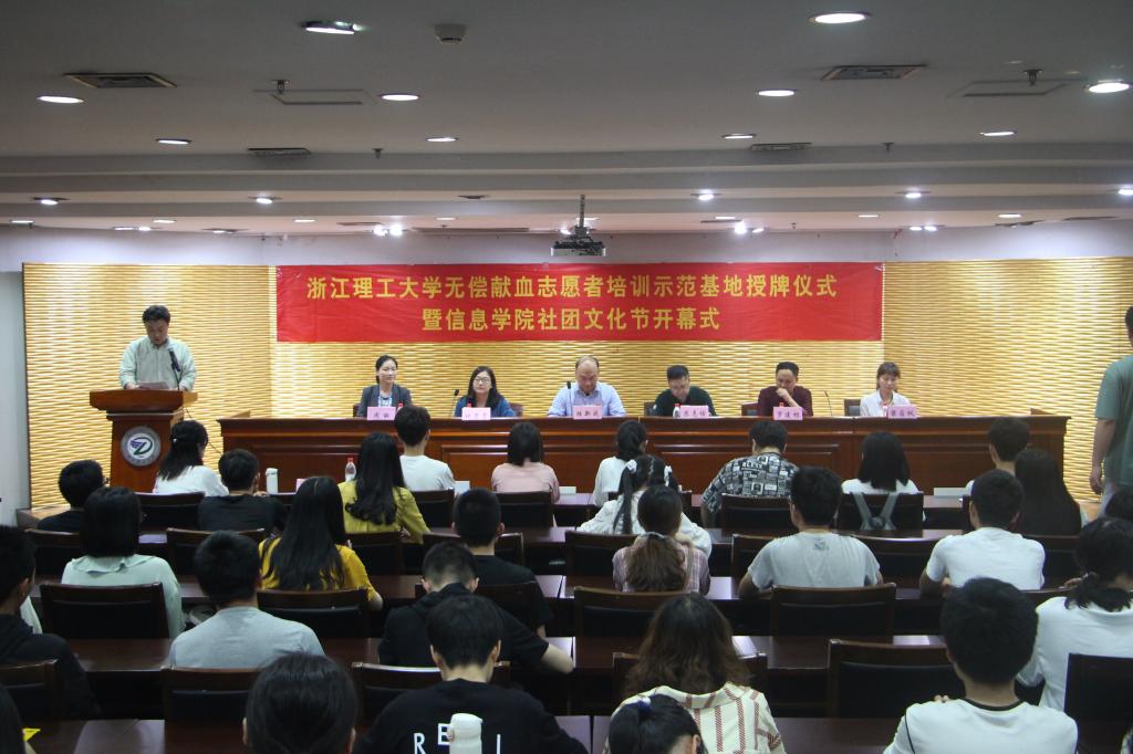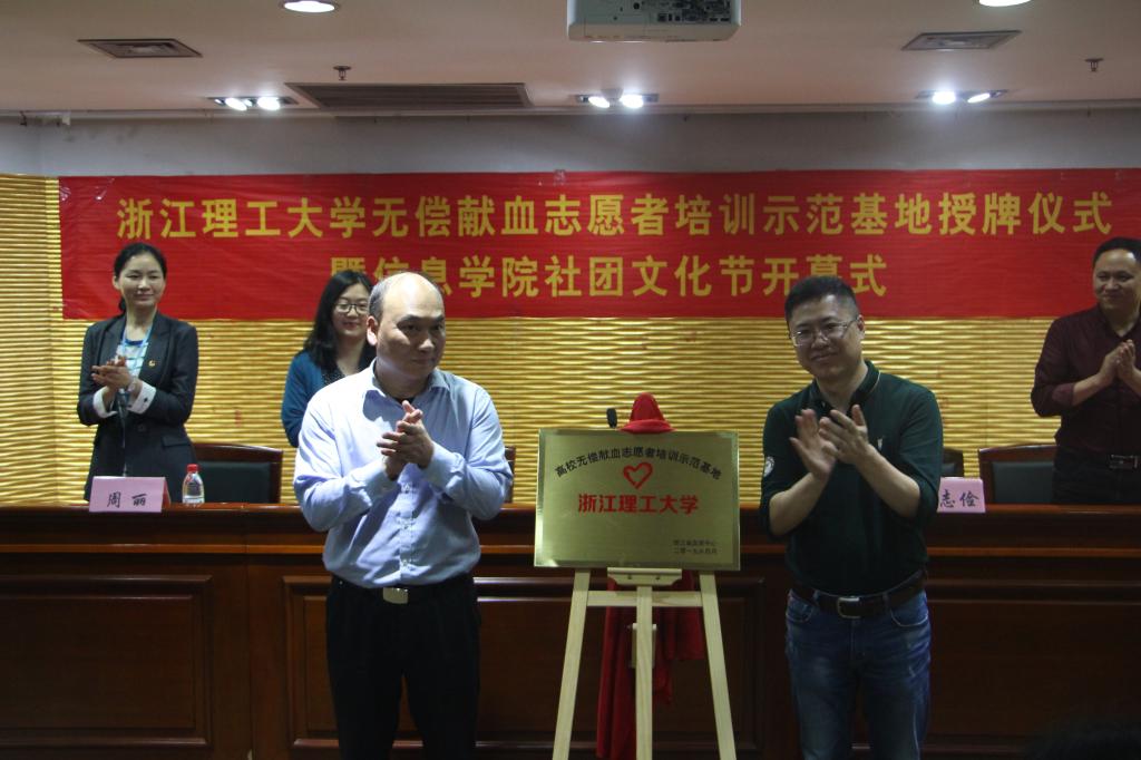 4月24日下午,tyc33455cc太阳集团成网官方入口无偿献血志愿者培训示范基地授牌仪式暨信息学院社团文化节开幕式在我校行政楼一楼报告厅举行。浙江省血液中心党委书记、副主任陆新成,浙江省血液中心社会事务科科长罗建根,浙江省血液中心团委书记周丽,我院党委书记苏志俭,校团委副书记祝莺莺,校医院院长梁若枫出席了本次会议,会议由我院团委书记尹小虎主持,会上进行了“tyc33455cc太阳集团成网官方入口无偿献血志愿者培训示范基地”的授牌仪式。