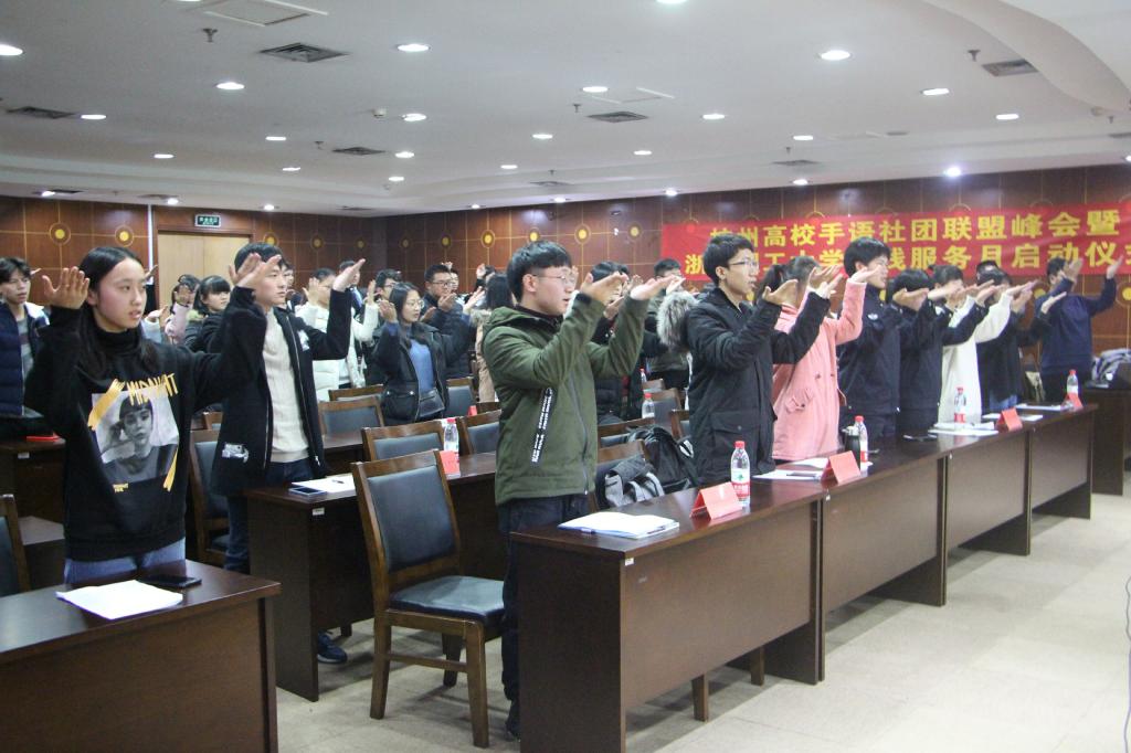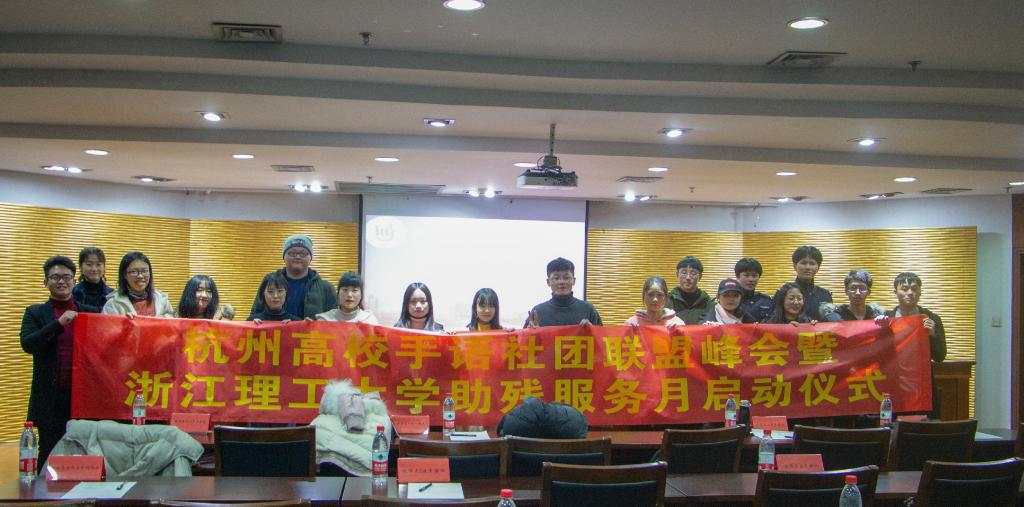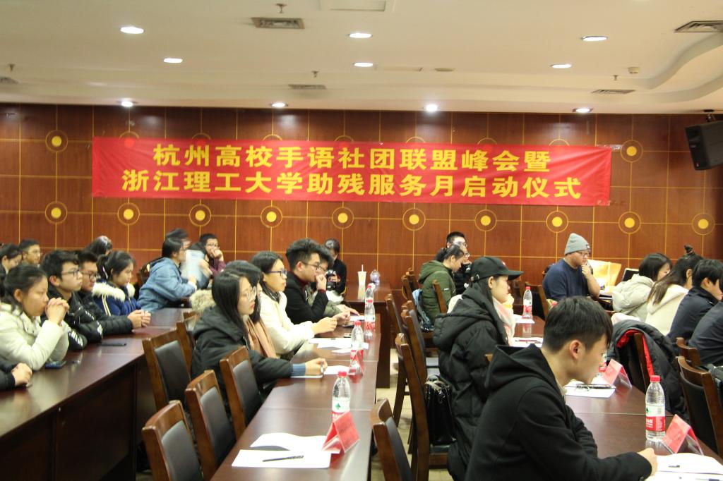 12月8日,杭州高校手语社团联盟峰会暨tyc33455cc太阳集团成网官方入口助残服务月启动仪式在我校行政楼一楼报告厅举行。浙江省残联就业中心手语基地负责人、就业中心培训科科长、我校手语社校外指导老师董慧芳,我院党委副书记方水明,学生工作办公室主任尹小虎,我校手语社指导老师顾林彬以及杭州市11所高校手语志愿者代表出席了本次会议。