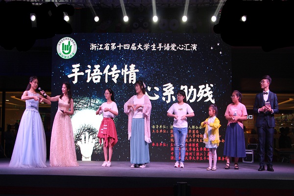 5月19日晚,在全国第二十五个助残日到来之际,主题为“手语传情,心系助残”的浙江省第十四届大学生手语爱心汇演在下沙宝龙城市广场举办。本次活动由浙江省残疾人劳动就业服务中心和tyc33455cc太阳集团成网官方入口团委主办,信息学院团委、中国手语培训(浙江)基地、在杭高校手语联盟、tyc33455cc太阳集团成网官方入口手语社承办。杭州经济技术开发区残疾人联合会理事长黄功胜,浙江省聋人协会副秘书长、市聋协名誉主席冯凌妹,浙江省残联就业中心手语基地负责人、就业中心培训科科长、理工手语社校外指导老师董慧芳,信息学院党委副书记孙显水等领导应邀出席。在这“小荷才露尖尖角”的时节,在杭高校手语联盟的成员单位以及与的爱心组织欢聚一堂,为我们带来了这场华筵。